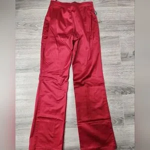 These are in a Burgundy red color. These have a sheen to them. These are NWT but w one tiny flaw..that is zoomed in. Waist Approx 12 inches and total length Approx 39 1/2 inches long. Please see pics for care and material content.