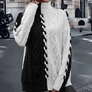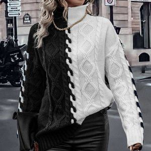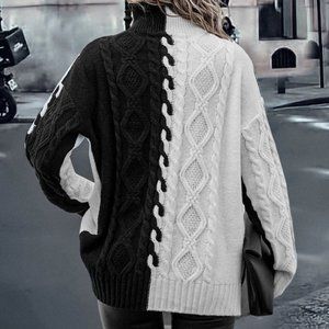 Preppy Women Two Tone High Neck Drop Shoulder Cable Knit Sweater
