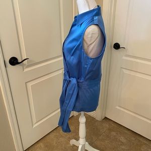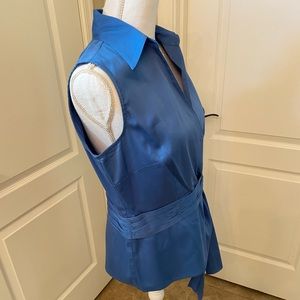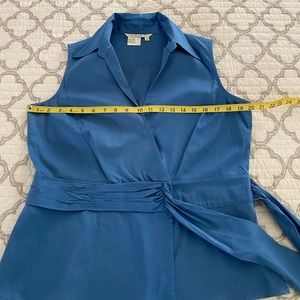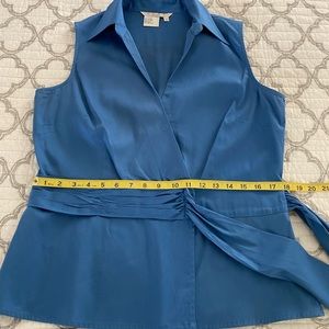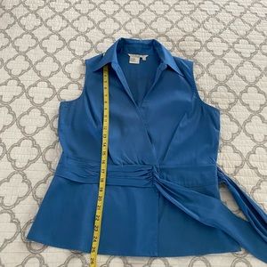 Como stretch cotton/spandex side tie blue sleeveless top, size Large. Snap closure at breast, button closure at waist. Measures 20” armpit to armpit, waist measures 18”, length is 25” shoulder to bottom of garment.