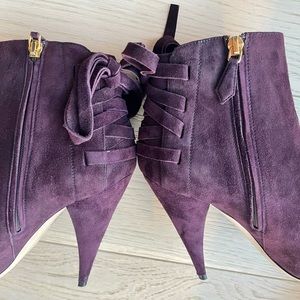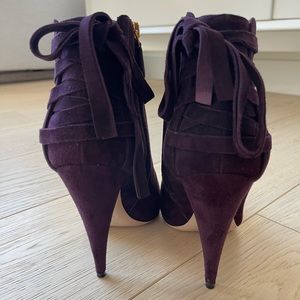 Rare find Gorgeous Miu Miu Suede Stiletto Booties in dark purple. Approximately 4.5 inch heel, boot shaft height roughly 8 inches to ground. No platform in front. Side zipper closure. Decorative lace tie on back. Size 7.5, runs a bit smaller, suitable for regular size 7 feet.
