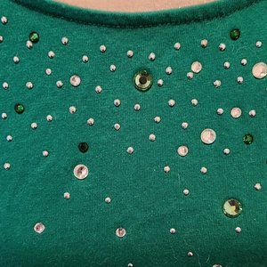 Glittering embellishments touch up this crewneck 3/4 sleeve tunic.