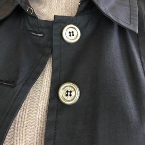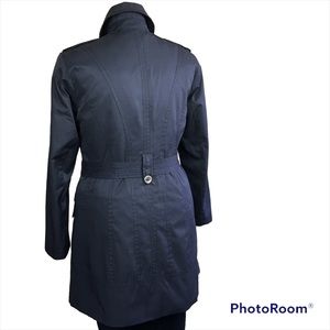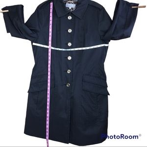 Beautiful and comfy trench coat, Has gold accented buttons and leopard print on the inside, Classic epaulettes at shoulders, 6 pockets in front, Tie it at the waist, Black Color. The material is water resistant, Perfect for those gloomy rainy days. Excellent preowned condition with hardly noticeable scratches on buttons. Sz.XL Please use my photos as part of description. D3