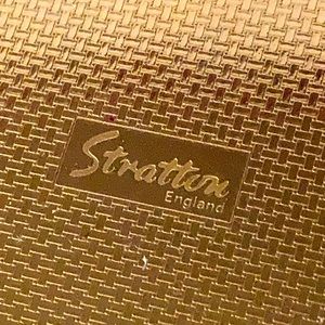 1960,S Wedgwood Jasperware & Gilt Bronze Mirrored Powder Compact by, Stratton, England This English blue authentic Jasperware Wedgwood insert with white high relief cherub motif features a gilt gold brass surround and detail. The interior contains a built in mirror and the self opening powder lid which is also decoratively designed Once compact is opened just past half way the powder lid pops open and the original sifter mesh is in its place. The original powder has been removed for health reasons. Could be used for your favorite compact or loose powder, a photo, pill box or basic small protective container for travel or display. Signed on the underside (engraved) Stratton England. Signed on the interior with an engraved patent number. Ships in a JMD Boutique gift box.