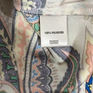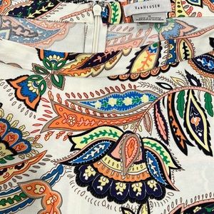 Beautiful Van Heusen Midi A-Line skirt. Fabric is 100% polyester drapes and flows nicely. Cream background with multi-colored paisley floral pattern. Dress it up or dress it down: add a solid short-sleeve sweater, t-shirt, tank or blouse and throw on a jean jacket for a timeless look.
