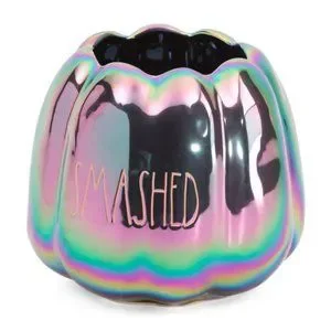 Brand new, in box- Rae Dunn, super cute ceramic Iridescent pumpkin planter. This must have décor, has an iridescent finish with text detail that says, "Smashed". The planter measures about 7"x7". Was removed from box for photos only. Comes from smoke-free, pet-friendly home.