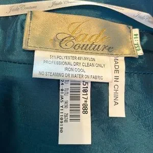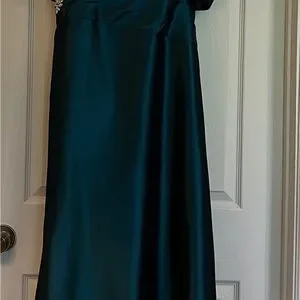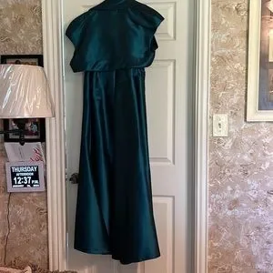 Jade Couture teal mother of the bride off the shoulder gown and with bolero jacket. Size 14 that was altered in length for a 5’3” woman. Armpit to floor length is 50 inches. From top of bodice center front to bottom of gown is 51”. Gown worn once. Prom, formal evening, gala, black tie, wedding