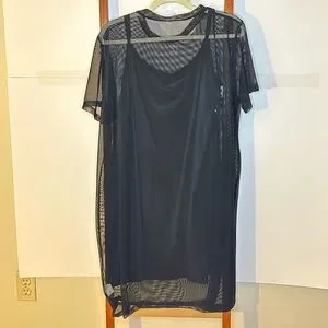 This dress is actually 2 pieces! The eye design dress under layer is a spaghetti strap stretchy material. The outside layer is a mesh dress. Very loose style. Can be worn separately if desired. Never worn but no tags.