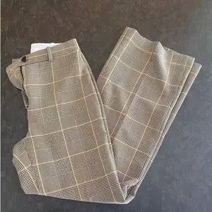 Size 2, excellent condition! These are high-waisted, wide-leg trousers with a tailored silhouette. They're made with a stretchy fabric that is yarn-dyed, which means the check pattern is woven right in