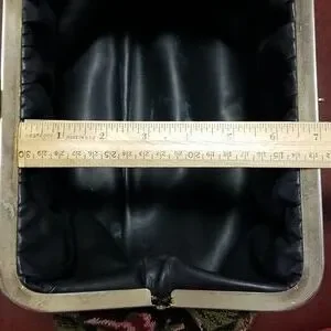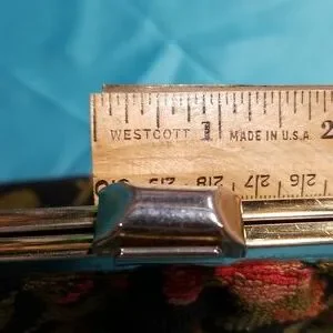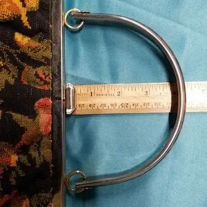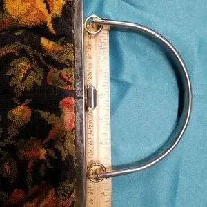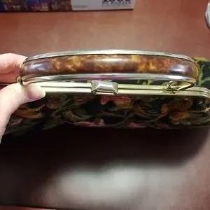 EUC. Circa late 1950s Julius Resnick colorful floral tapestry bag. Black synthetic leather interior lining with "JR usa" stamped in gold. (1) 6" wide goldtone metal handle with faux tortoiseshell has a 4" drop. Hinged metal frame maximum 6" opening with single 1" wide clasp that clicks shut. Minor flaws.