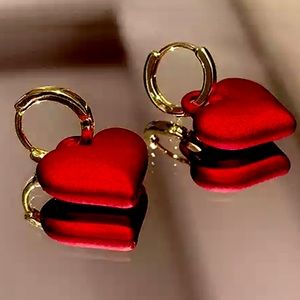 These earrings feature a playful and romantic design with bold red heart-shaped charms hanging from small, polished gold hoops. The matte texture of the hearts gives a soft, almost velvety look, creating a charming contrast with the glossy finish of the hoops.