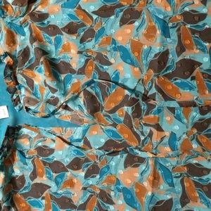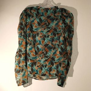 lined, v neck, tie close neck, shirt ruffle neck, lightweight fabric, textured, puffy shoulder