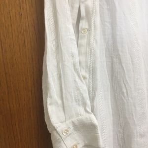 Button front & buttoned sides. Side slits. Long sleeves with button cuffs. Box pleat in back.