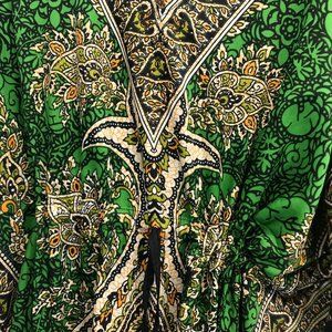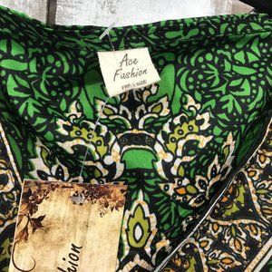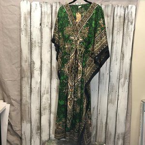 Fashion kaftan is one size in a Emerald Green color floral tribal design. Worn as dress, loungewear, tunic, or robe. Other main colors are gold, black and green orange print, with glitter embellishment to give it a rich silky look, very beautiful and quite stunning.