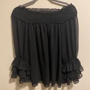 Beautiful Express Smocked Off-The-Shoulder Black Organza Material Top. Top has a bit of sheer to it. Long sleeved with tier ruffles on the bottom of the sleeves. This top is a statement piece!