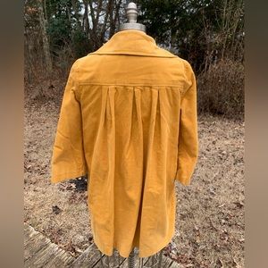 Mod Corduroy Jacket with large oversized shiny buttons with large Peter-Pan style collar. Has funky inner lining. Has 2 front working pockets. Vintage Style. Cool mustard yellow color! Cropped sleeves!
