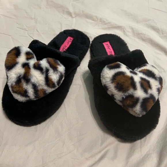 Black fuzzy slippers with a leopard print heart on the front of both shoes. Slippers are new without the tags. Very soft. The brand is Betsey Johnson. Size is a medium (7-8)