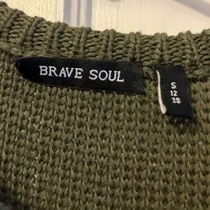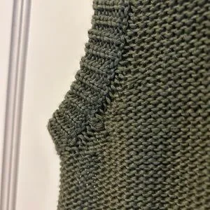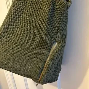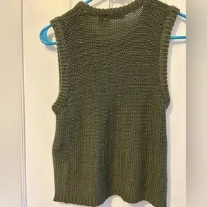 This is a size small gently worn sweater with no sleeves and gold zipper up each side about half way. It has a minor snag on the back by one arm hole, see picture.