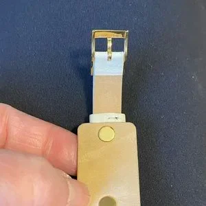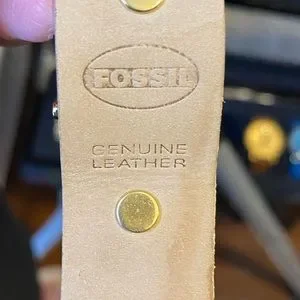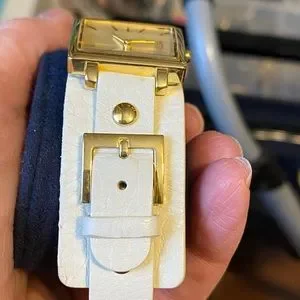Like new Fossil watch, gold tone, with a rectangle shaped faces and a cream colored genuine leather band. This watch has never been worn and is in excellent condition. It just needs a battery. I can’t make any guarantees because I cannot get the back off.