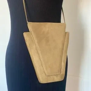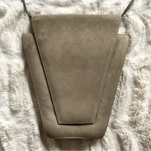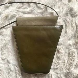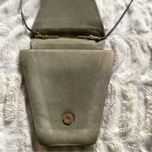 Love the geometric lines and angles of this vintage purse by Charles Jourdan. Amazing design: very 80s deco! Smooth suede (or nubuck) and leather. Great neutral color: a soft olive green / greige. Versatile bag: can be worn as a shoulder bag, crossbody or clutch. (Note that the color is off in the photo on mannequin). Excellent, clean condition (had only one owner).