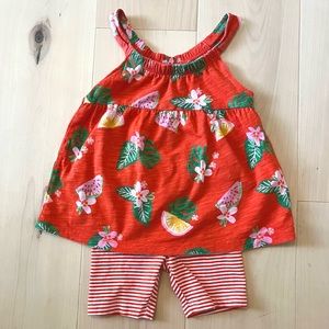 Adorable two-piece Carter’s set. Light weight cotton tank top with matching striped shorts. Bright orange, pink and green spring/summer colors. Perfect for a hot day. Great condition, coming from a clean and smoke-free home.