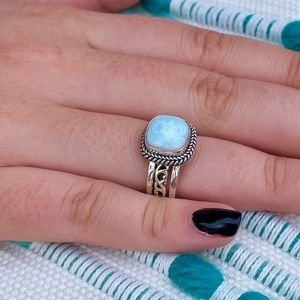 Excellent used condition. Beautiful opal ring with a rope a design around the bezel and scroll work on the band. Included are two additional sterling silver rings with a hammered design. The three rings stack beautifully together to make this a substantial ring set. Size 7.