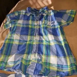 preowned. 5 shirts. No stains or tares, except the monster blue one in the back bottom of shirt. very light stain you could hardly see it unless your looking real good. 2 t-shirts, 2 button up shirts and 1 tank top.