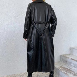 PLUS SIZE BLACK PU LEATHER COLLAR BELTED TRENCH COAT