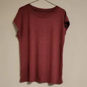 This boatneck t-shirt is on the longer side with short-cropped sleeve. Originally the t-shirt had a front pocket that was flimsy so I removed it...looks much better. There are tiny pinholes but you can't see them when wearing it. The t-shirt is a good weight to hold its shape and is not see through. Only worn a few times but don't fit me anymore. Material is 35% cotton and 65% polyester. (I washed in the machine with other like fabrics and hung to dry.) Measurements are as close as possible. The colour is a mottled red and white that looks like a brick red. Width 21" Length 27"