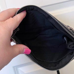 Cute paisley crossbody bag from Liz Claiborne in excellent used condition (EUC). Colors are raspberry, tan, black and white. I used it occasionally as an evening bag. Exterior is polyvinyl, and interior is solid black polyester. Silver hardware in great shape, very shiny. Zippered exterior pocket in front. Interior slots for 10 credit cards/ID and one open pocket.