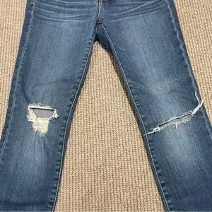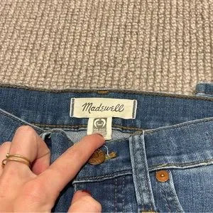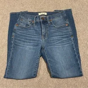 Super popular high-rise skinny jeans from Madewell. Sold out. Ripped knees. Blue denim wash. Zipper closure. Gently worn with no flaws. Great condition. Size 24. Fits true to size. A beautiful pair of jeans and a true staple design!