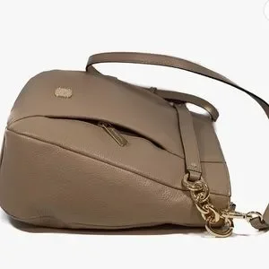 LIKE NEW; Soft supple pebbled leather in neutral beige shade and bright shiny gold tone hardware with no show of wear! Longer convertible strap in orig pkg never used. Interior shows multiple pockets (4)