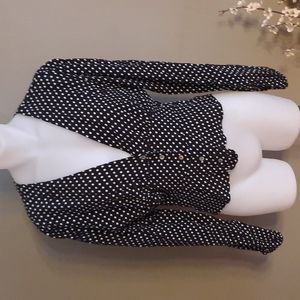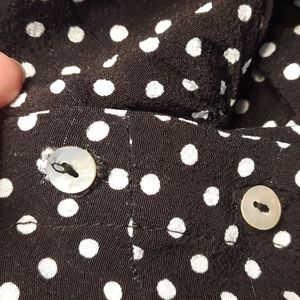 Free people black and white polka dot button front blouse. Viscose. Very flattering fitted more on bottom, with pleats around bottom of breasts. Only flaw which I corrected was the first button whole stitching came out but re sewed around to secure( I'm not a seamstress but I thought it worked well!). can't notice when buttoned but button stays put now. Pit to pit 17". 13" under breast. Armpit to side hem, 9.5".