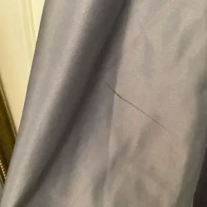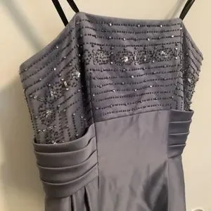 Full length ballgown, lilac with beaded top, satin material, strapless (black straps in photo are for hanging only). Zipper in back. Layered underneath to provide volume in the skirt. Wire lining in the bust for added support and shape. I’ve worn it once to a formal occasion, very comfortable and though strapless it stays up well without needing to adjust throughout the night. I’m a 34 DD bust and did not need a bra with this, it snugs well and provides its own support.