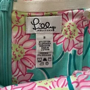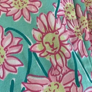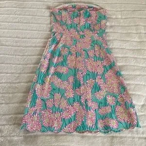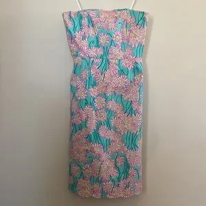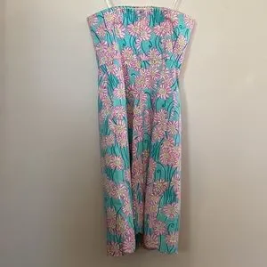 Vintage white label Lilly Pulitzer strapless dress in size 2. Blue Grass Lion print with daisies with hidden lion heads in some flowers. Shades of blue-green, pink and yellow in the pattern. Scalloped hemline and boning in the bodice. Adorable and in amazing condition.