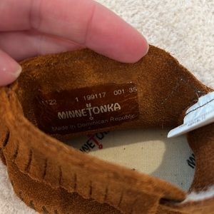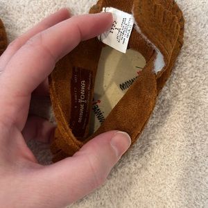 Like new Minnetonka suede leather baby moccasins in size 1. Comfort plus Velcro® makes this an easy on, easy off fringe bootie must-have. The super soft suede and fully padded insole are so comfortable that your child will never want to take them off. The durable soft suede sole protects little toes while the front strap holds the foot for a perfect stay-on. Size 1 is 0-3 months but as these run a bit large most infants can wear them a bit longer. Approximately 4 1/2 inch sole