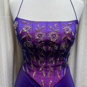 Top is embellished with floral beading with a corset back