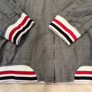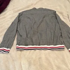 HAS RED WHITE AND BLUE AT ENDS OF SLEEVES AND AROUND WAIST OF JACKET