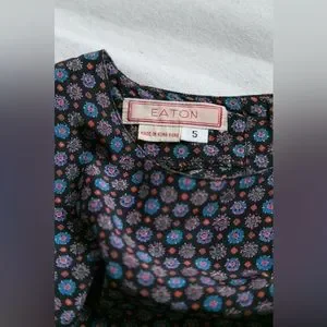 Petite Eaton's vintage 100% silk printed dress. Elastic at waist, buttons down back, pleats on chest and gathering on skirt. Gathered cuffs with buttons on sleeves. Slight discolouration at underarms but hardly visible. Tagged size 5 best first modern XS-S or 2/4.