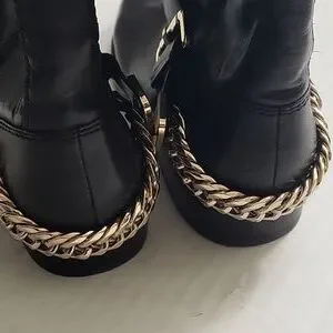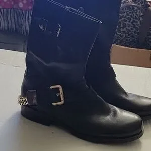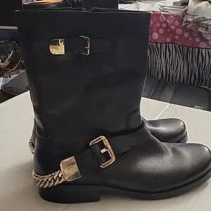 Good condition. does have some peeling on the inside of the boots check pics and video. Gold chain details. size 6.5 belt details. leather.
