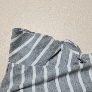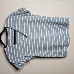 Super cute top with flutter ruffle short sleeves. Gray with white stripes. Only worn a couple of times, maybe twice. Hem on back needs to be restitched. Easy fix for those who sew.