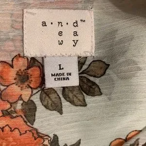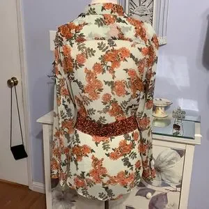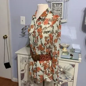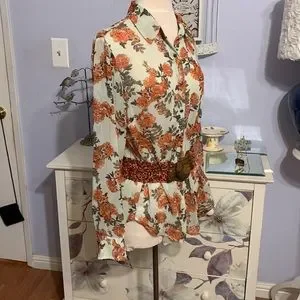 This lovely shirt tail blouse is semi sheer in pale tan with bright tangerine flowers and green leaves. It has a long hem and I’ve shown it worn a few different ways. I’ve tied it behind my back, leaving a bustle behind me. I’ve tied it in front- more common and I’ve belted it. You can always tuck it in or just leave it untucked. So versatile and so bright. (Belt not included)