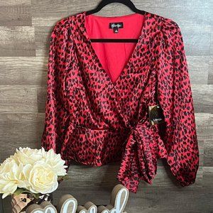 NWT. Medium Red Animal Print Satin Wrap V-Neck Blouse