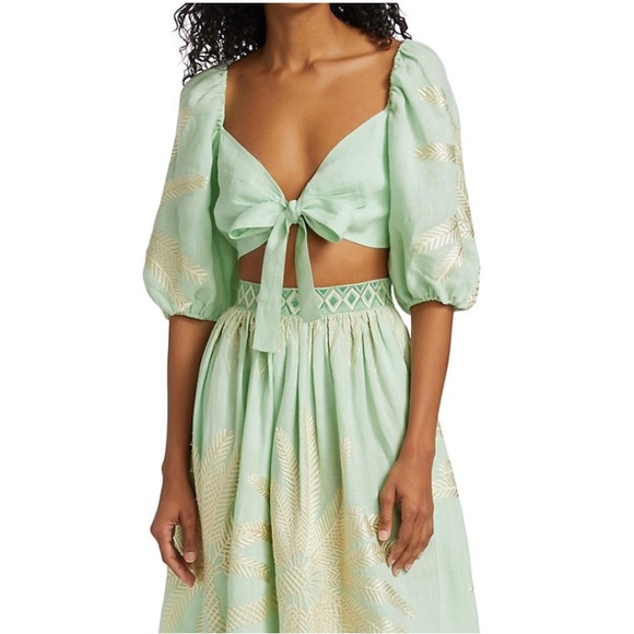 Since its conception in 2013, Emporio Sirenuse has skillfully contextualized Amalfi Coast-inspired styling through a Mediterranean lens. Cut in an ultra-cropped silhouette, this top is complete with a knotted front and large palm tree embroidery at puff sleeves.