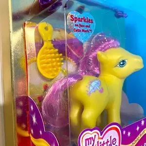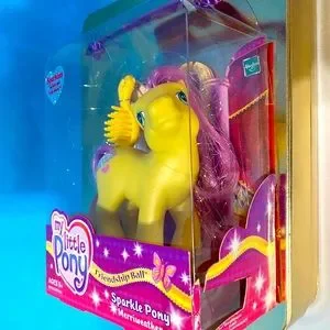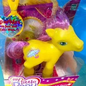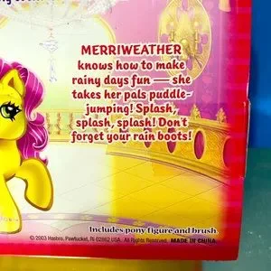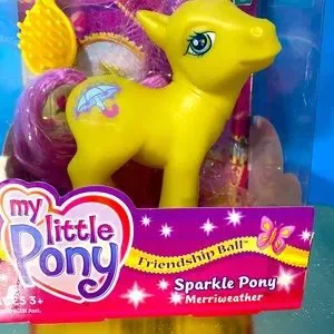 My Little Pony G3 NWT Vintage 2003 Friendship Ball Sparkle Pony MERRIWEATHER #60259 By Hasbro Includes Pony Figure w/Yellow Body, Pink Tinsel Hair, Sparkles On Face & Umbrella w/Rain Cutie Mark Symbol, Packaging may have minor blemishes, Package Size 7”x5”x3”
