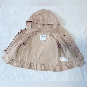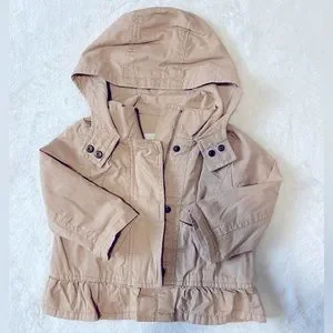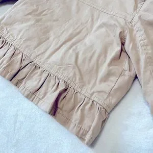 Old navy toddler khaki jacket. Super cute ! The bottom has ruffles and is lightweight. Pockets in the front and zipper and button closure.
