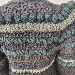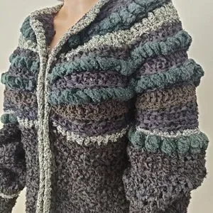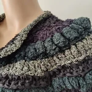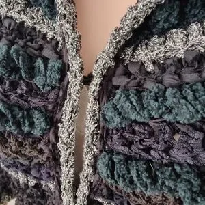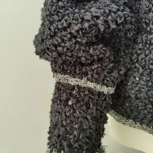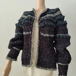 Clothes Art Estelle Gracer sweaters are unique, usually one of a kind, woven sweaters. This sweater jacket is a black ribbon yarn with embellishments that have some sparkle! This sweater is a woven piece of art from 1982.
