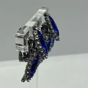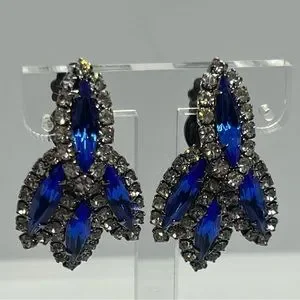 Stunning blue and clear rhinestone sparkly dangle clip on silver tone earrings. These are in good used condition. See all photos for details and measurements