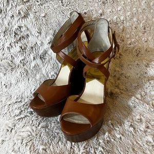 EUC [Michael Kors] Strappy Brown Leather Platform Peep Toe Wedges High Heels | 8