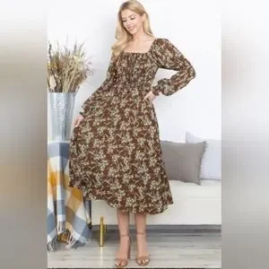 Beautiful brown floral printed dress with square neckline and tier ruffle details.