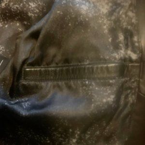 The jacket zips up the front and has a belt around the waist. On one (1) side of the interior of the jacket has a open pouch trimmed with leather. The other side of the interior of the jacket has a zippered pocket on the interior lapel. On the exterior of the jacket, in the front, are two (2) zippered pockets. The sleeves have zippers at the cuffs. In addirrion to the metal logo on the back of the jacket, there is a lace up decoration.